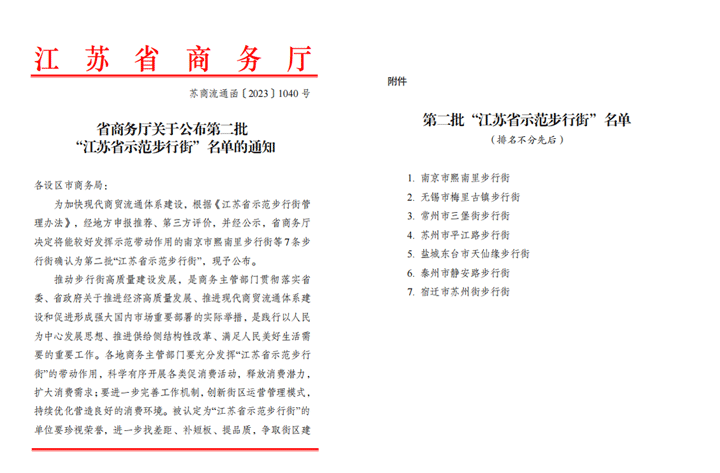 近期,蘇州街成功入選江蘇省示范步行街,成為宿遷市首家且唯一一家江蘇省示范步行街。