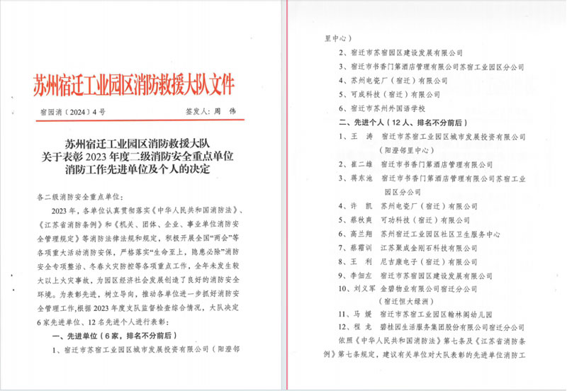 近期,陽澄鄰里中心獲評園區(qū)“2023年度消防安全管理工作先進單位”,公司消防安全管理員王濤獲得園區(qū)“2023年度消防安全管理工作先進個人”。