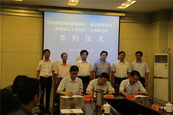 7月21日下午,蘇州獨(dú)墅湖科教創(chuàng)新區(qū)管委會(huì)、宿遷市科學(xué)技術(shù)局、蘇州宿遷工業(yè)園區(qū)管委會(huì)三方戰(zhàn)略合作協(xié)議簽約儀式在宿遷舉行。根據(jù)協(xié)議,三方將在科技資源轉(zhuǎn)移、科技平臺(tái)建設(shè)以及科技環(huán)境優(yōu)化等方面推進(jìn)合作。這是蘇宿兩地合作內(nèi)涵逐步深化、合作領(lǐng)域不斷拓寬、合作水平全面提升的重要體現(xiàn),更是深入貫徹落實(shí)省委、省政府部署的重要舉措。市委副書記、市長(zhǎng)王天琦,副市長(zhǎng)、蘇宿工業(yè)園區(qū)黨工委書記、管委會(huì)主任方文浜,市政府秘書長(zhǎng)章其波見(jiàn)證簽約。
